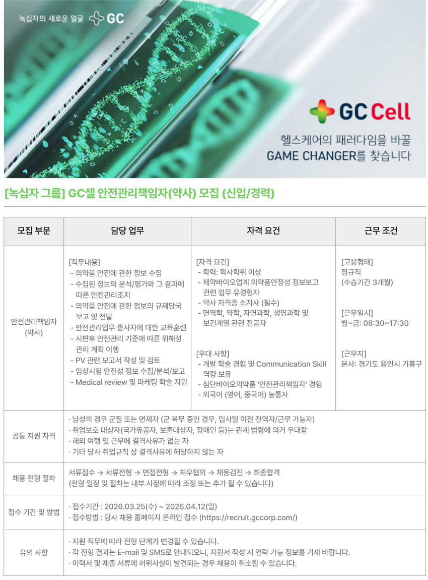 : https://careers.gcbiopharma.com/job/GC%EC%85%80-%EC%95%88%EC%A0%84%EA%B4%80%EB%A6%AC%EC%B1%85%EC%9E%84%EC%9E%90%28%EC%95%BD%EC%82%AC%29-%EB%AA%A8%EC%A7%91-%28%EC%8B%A0%EC%9E%85%EA%B2%BD%EB%A0%A5%29/3948250/