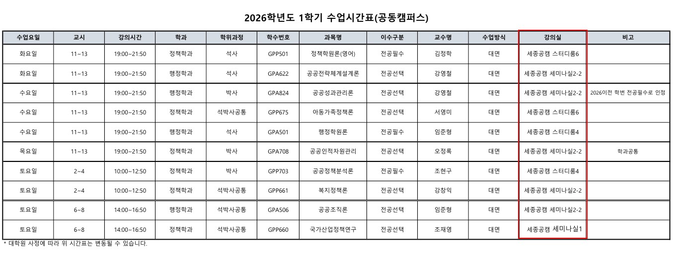 *학사 문의: 세종공동캠퍼스 수업 관련 문의는 임시 사무실인 3층 302호실로 내방 바랍니다.